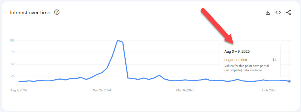 We are here - August 3 - 9. 🕵️ In this graph from Google Trends, we see a year in Google search for the term "sugar cookies." That peak is the week before Christmas. That trough? That's us literally this week. 🎄 So if Christmas is 100%, bakers are looking at 14% of our highest order volume (📉 data doesn't exactly mean that, but it can be extrapolated as a decent representation of our calendar year as bakers).