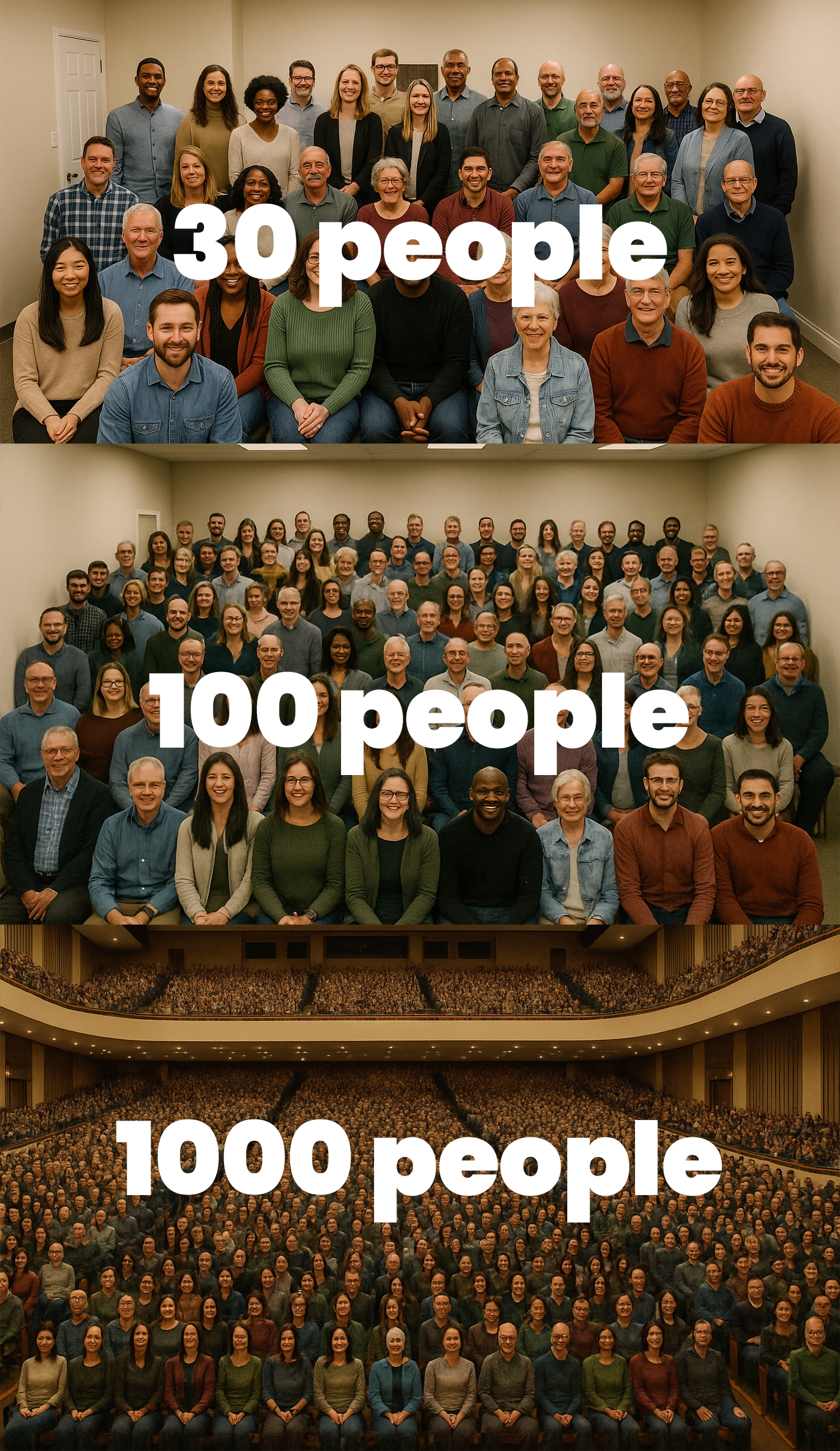 How about an auditorium of 1,000 people? That'd be a MASSIVE audience. Yet when we see the reach of "30 people" in our Facebook metrics, out the window goes the thought that those people ARE potential buyers.