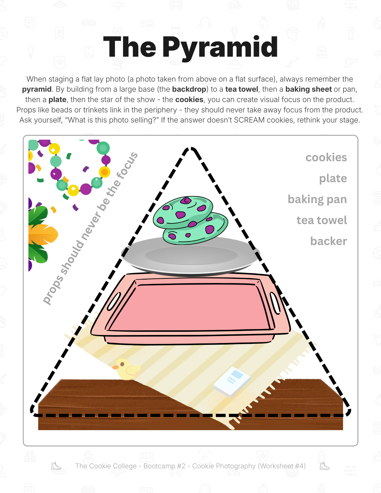 Referring to the "pyramid" worksheet, build from the bottom up. Pyramid style staging keeps it simple: a backer, a tea towel, a baking tray, a plate, and your cookies. Sprinkle some props in the periphery (and don't be afraid to crop the prop), and you've set the stage for cookies that create a want in your clients.