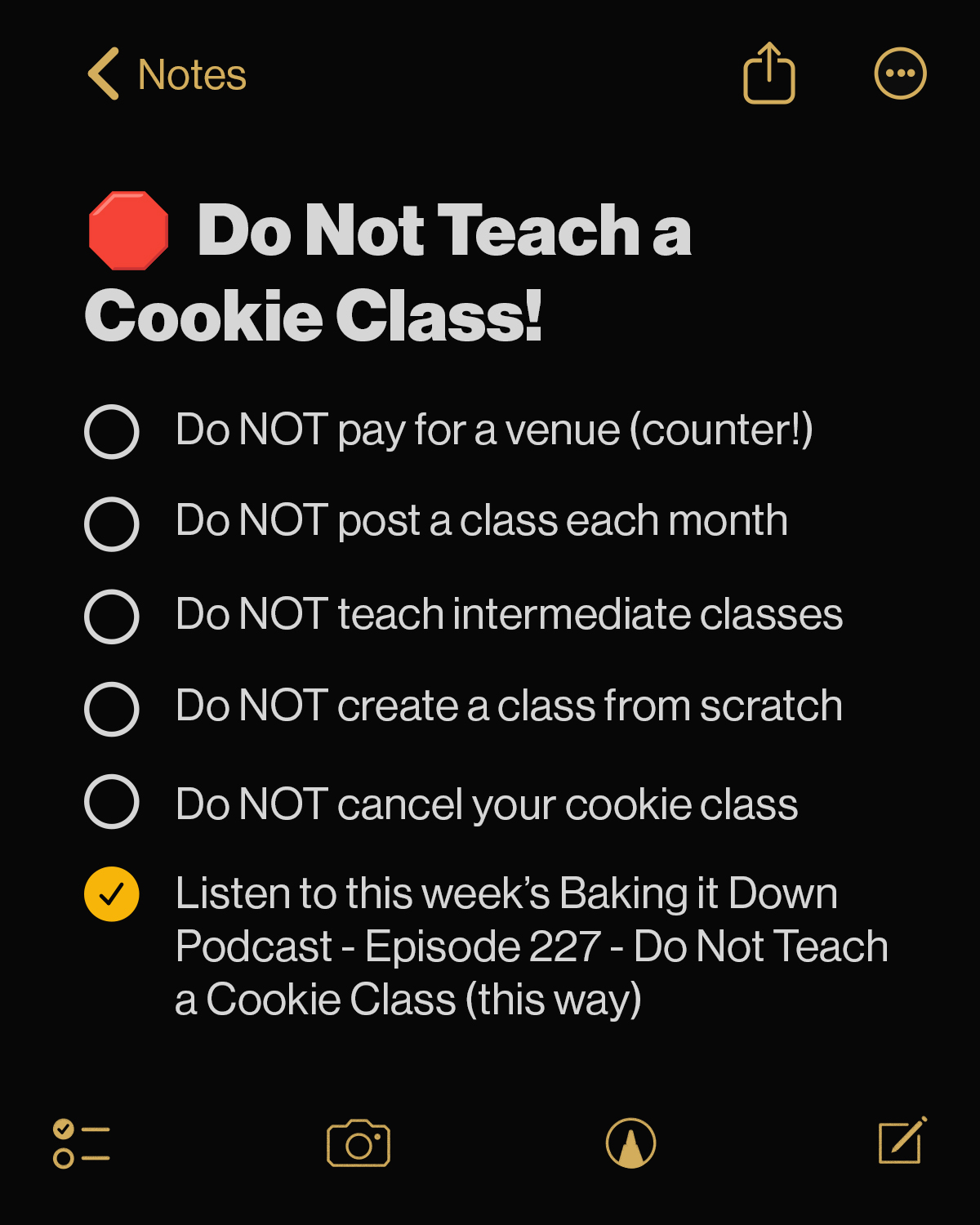 In this week's Baking it Down Podcast - Episode 227 - Do NOT Teach a Cookie Class (this way), Corrie and I list out the things we wouldn't do if we were getting into cookie classes (yeah, yeah - the title is a bit of a clickbait, but hey, we're marketers, right?).
