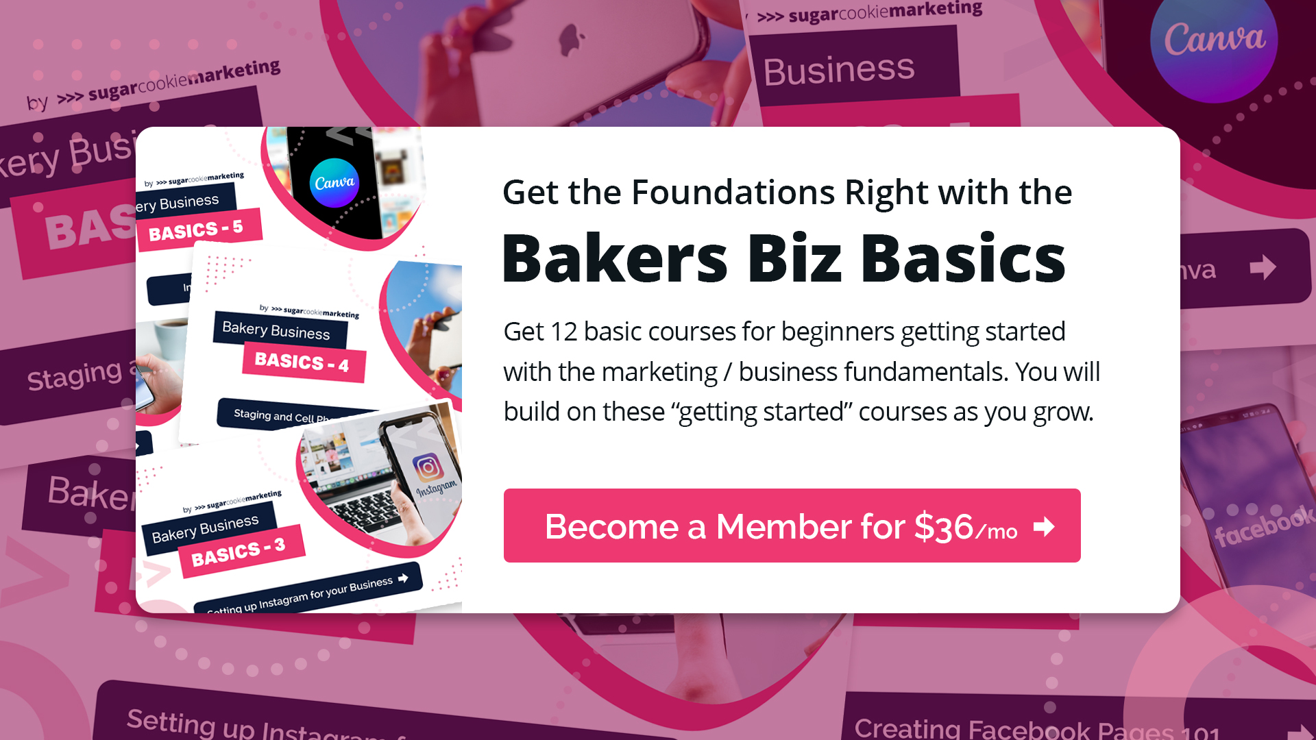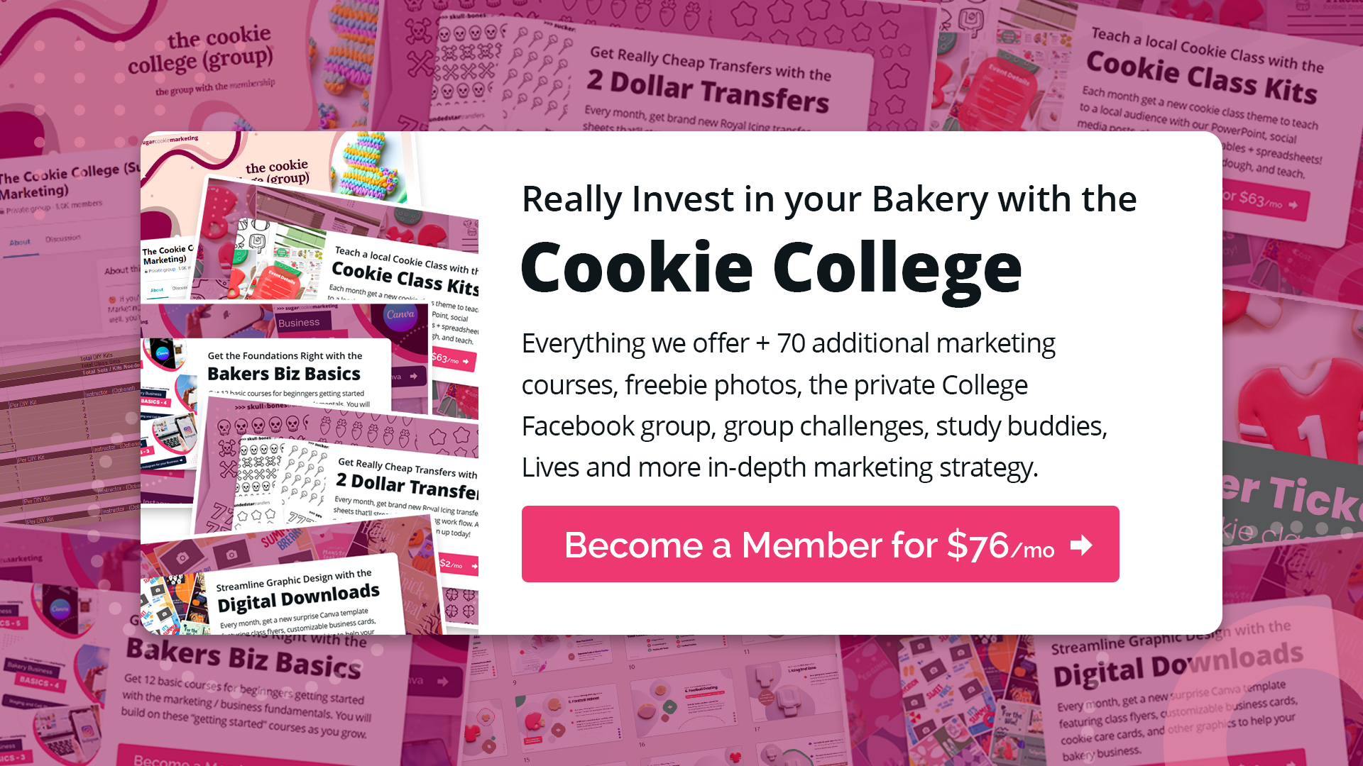 Each of the five memberships is designed for different aspects of the cottage baker's business journey. The top membership - The Cookie College ($76/mo) - is our biggest membership, and it's meant for the baker who is thinking, "This hobby is costing me a fortune, I gotta make some money back." We teach marketing strategies that increase lead generation and decrease marketing stress.