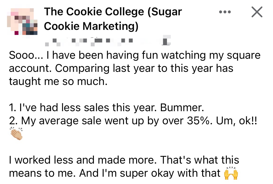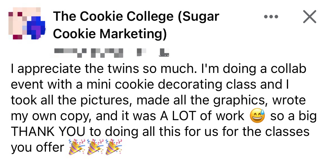 ๐ฉโ๐ In the Sugar Cookie Marketing group, we cover marketing strategy, photography for better product images, social media trends, and bottom-line basics to help cottage home bakeries make more money while working less.