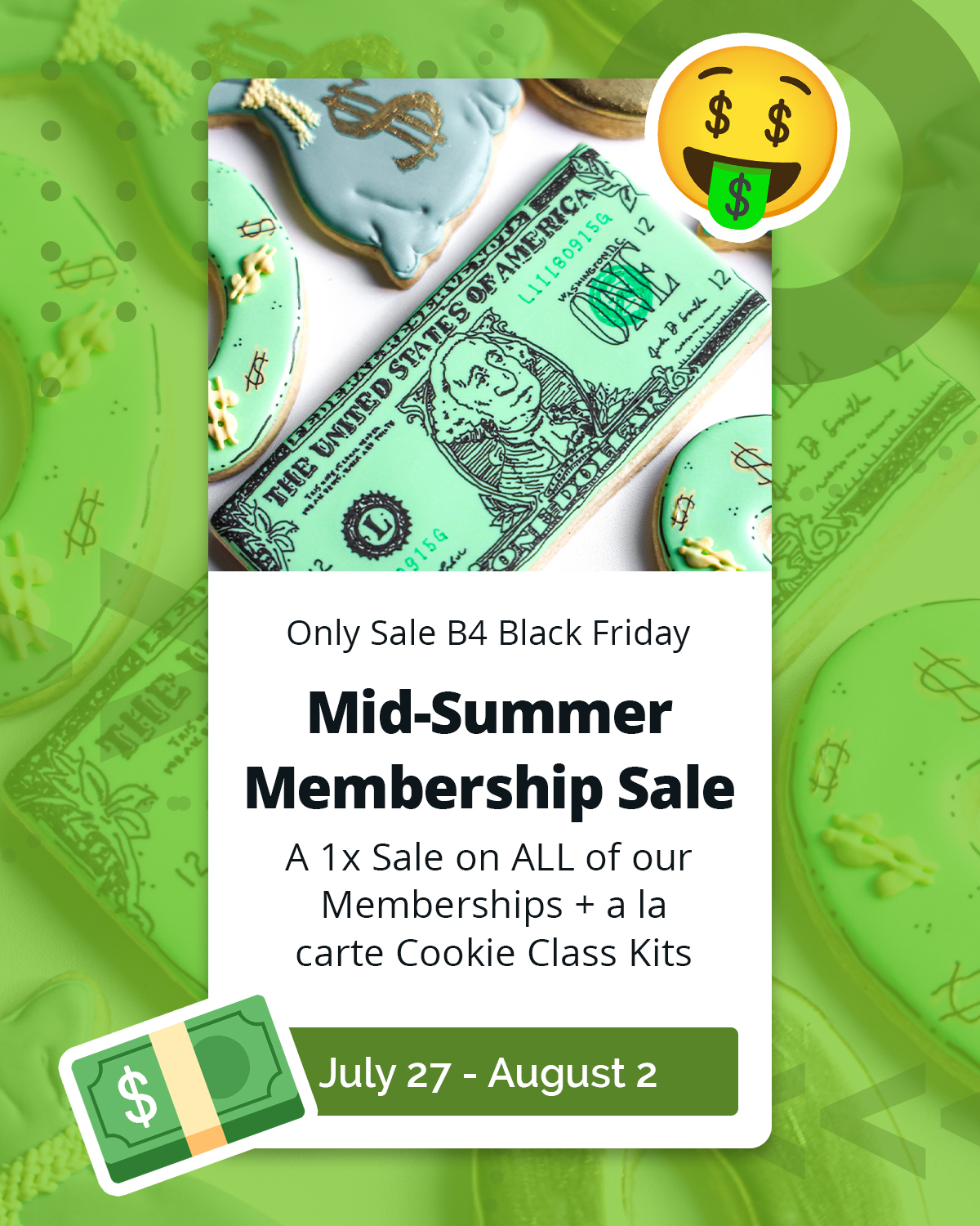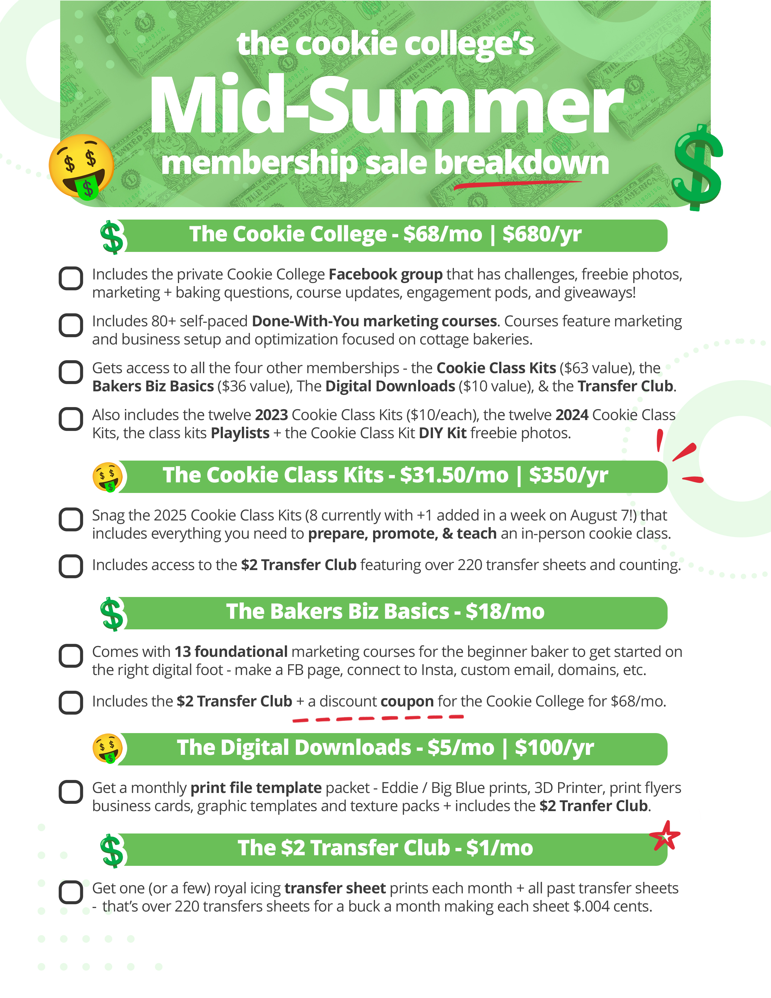 As a lil' thanks for stickin' with us for a year, on top of the Mid-Summer Savings, we're adding TWO months f-r-e-e to The Cookie College, The Cookie Class Kits, and The Digital Downloads yearly memberships - that's compounding savings!